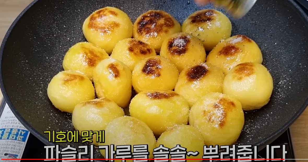 16분 삶아준 감자를 하나씩 뒤집어줍니다, 중불에서 알맞게 구워진 알감자가 적당하게 구워져 저 맛있어 보이네요.