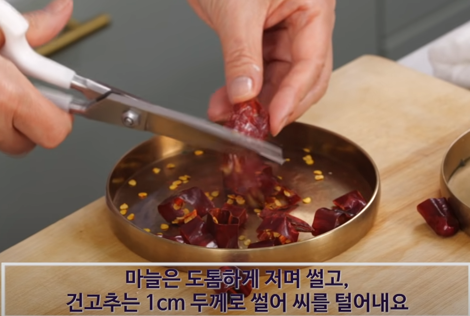 연근이 데쳐지는 동안 마늘은 도톰하게 저며 썰어주고 건고추는 1cm 길이로 썰어 준 후 씨를 제거해줍니다.