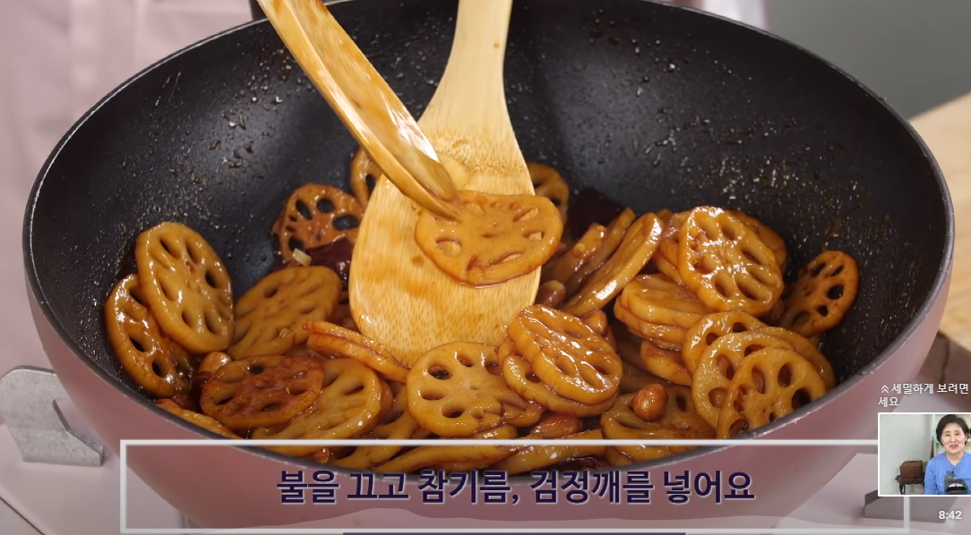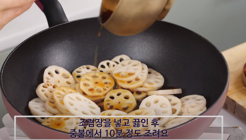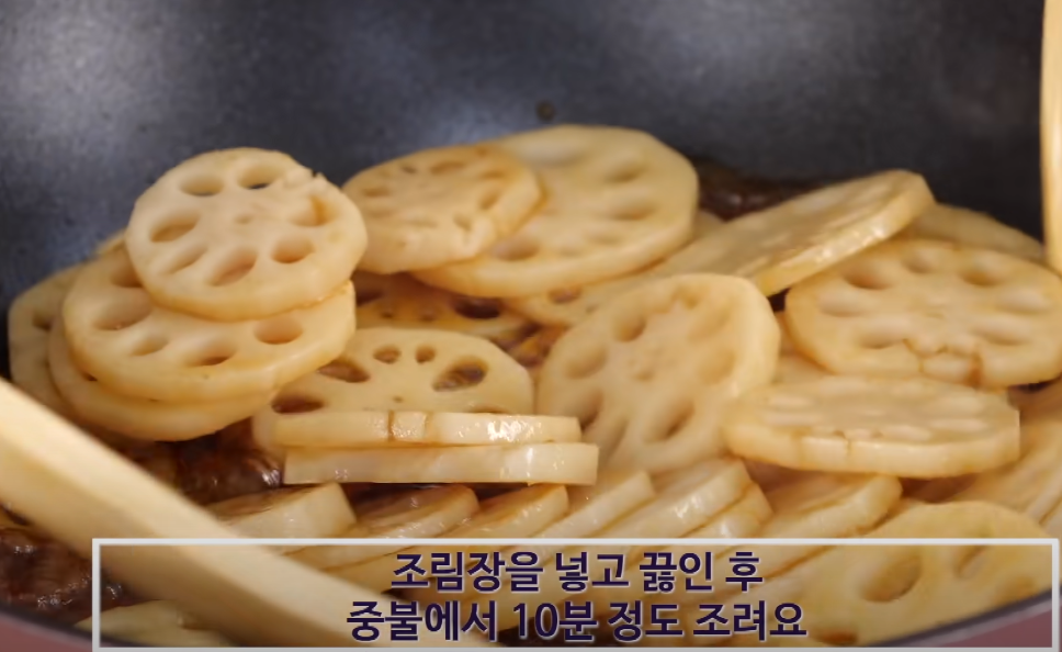 잡을 수 있는 황금레시피입니다. 중불에서 타지 않게 충분히 볶아준 연근에 양념장, 조림장을 넣어 중불에서 10분 정도