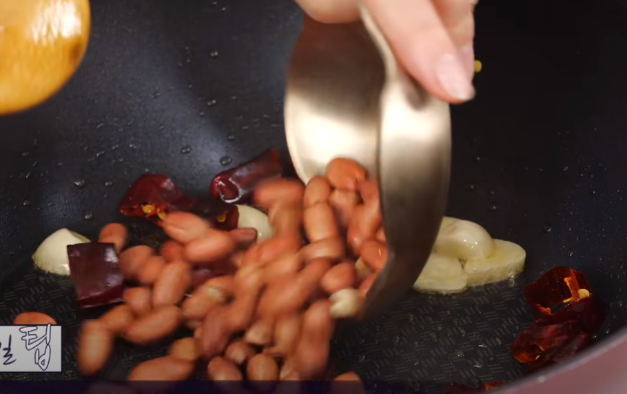 달군 팬에 식용유 2큰술 중 한 큰 술 넣어주고 마늘을 볶다가 건고추, 땅콩을 넣어 1분 정도 볶아줍니다.
