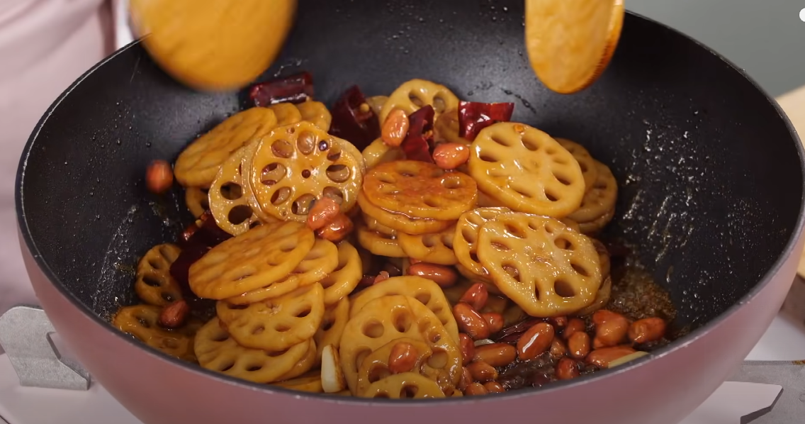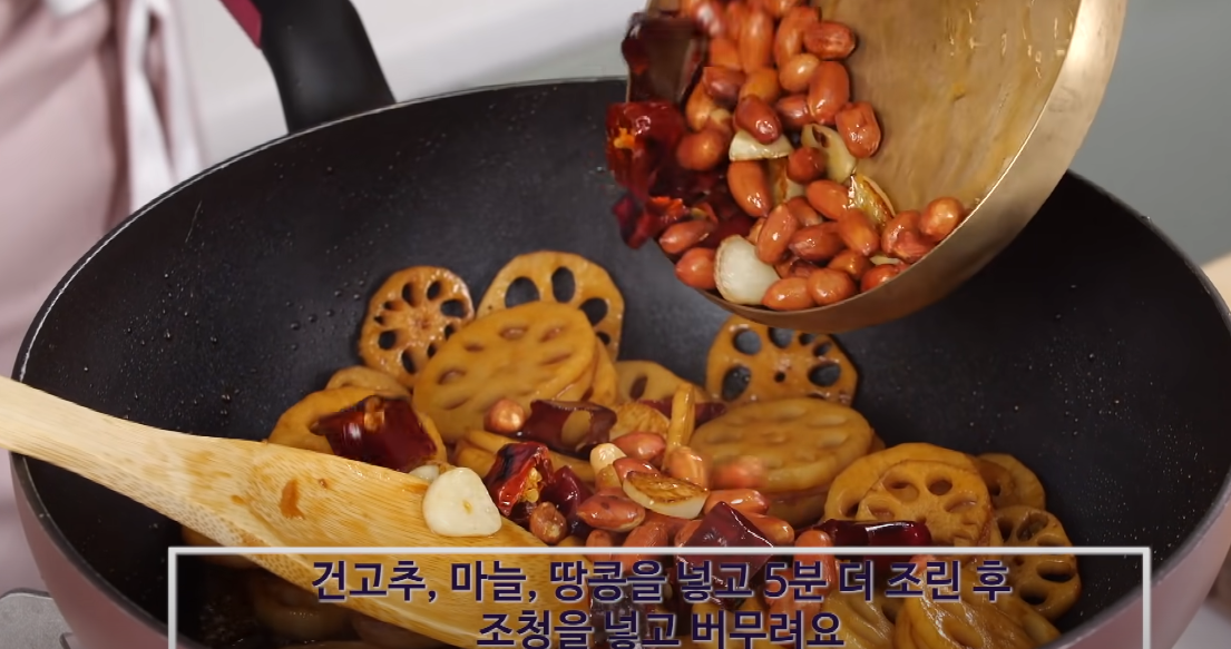 연근조림에 땅콩이 들어가면 맛이 굉장히 좋아집니다. 영양도 더 할 수 있으며 고소한 맛이 일품입니다.