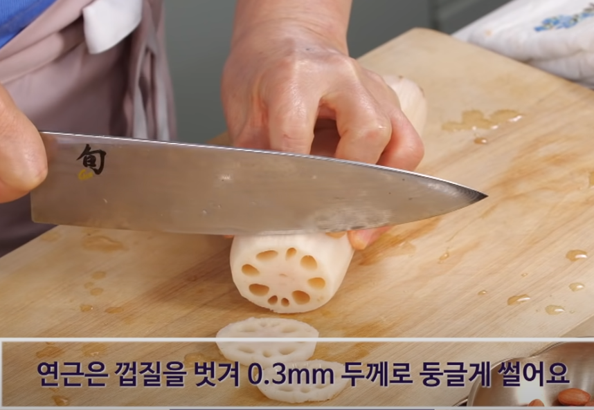 연근은 껍질을 벗겨 너무 굵지 않은 0.3mm 두께로 둥글게 썰어줍니다.