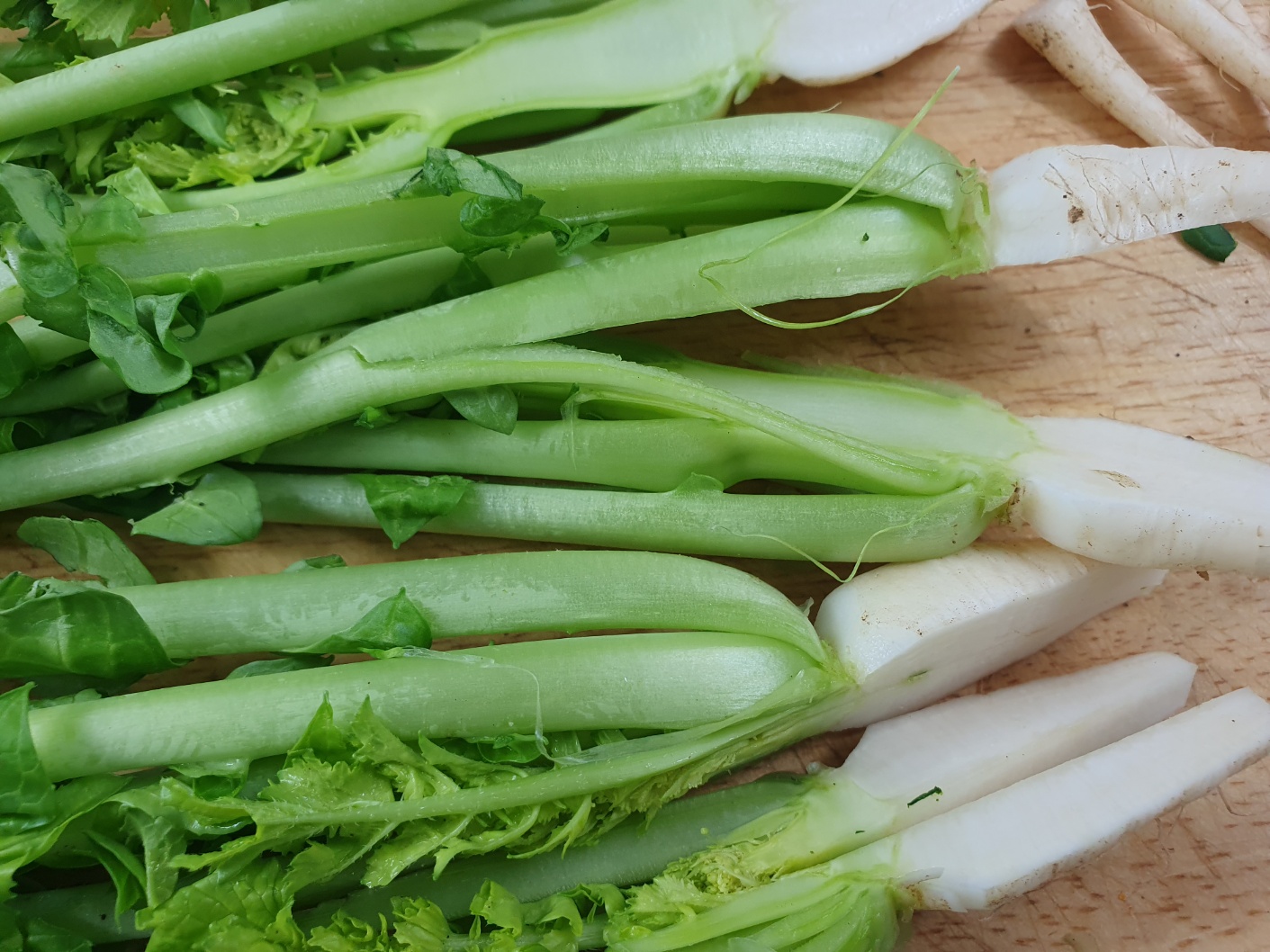 열무는 줄기와 부리사이의 흙과 이물질을 칼로 깨끗하게 도려내고 반으로 갈라 5~6cm 길이로 잘라 준비합니다.