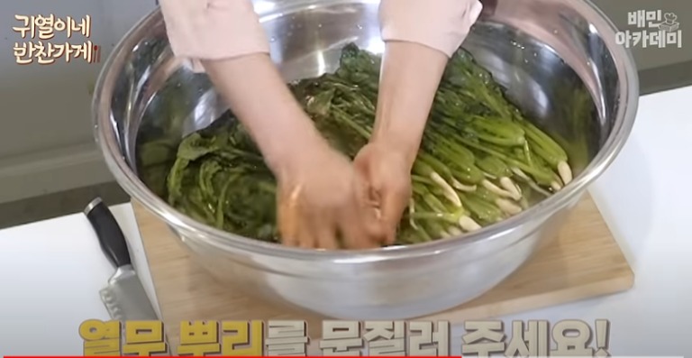 절여진 상태에서 열무뿌리를 소금물에 문질러 씻어주면 줄기에 절여지지 않은 부분이 골고루 잘 절여지고 줄기 사이