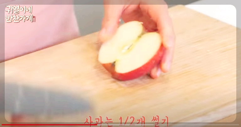 믹서에 갈아줄 양념을 만들어 준비합니다, 달고 맛있는 홍고추 300g 썰어주고 사과는 반개, 배 반 개를 썰어주세요.