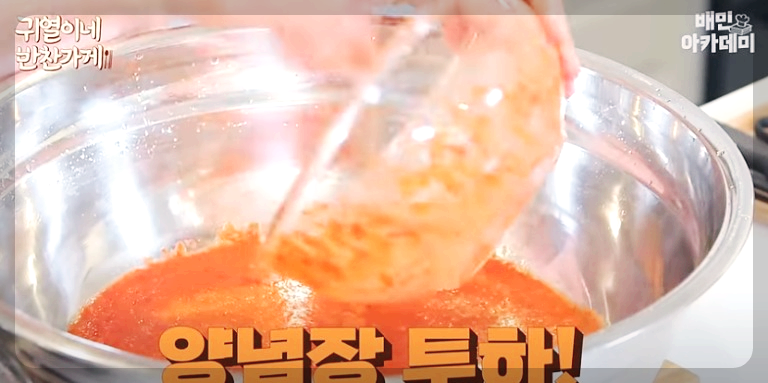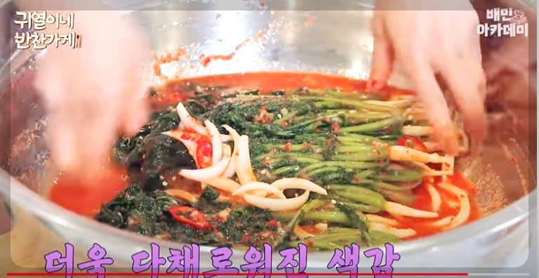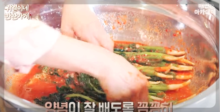 양념장에 손질한 열무를 담아 골고루 버무려주세요,