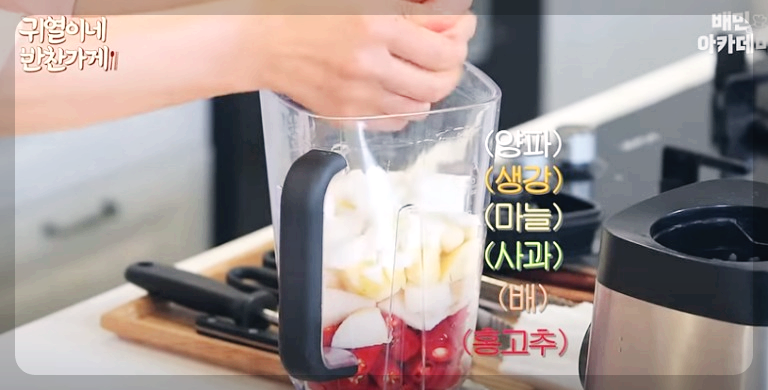 믹서기에 손질한 홍고추, 배, 사과, 양파, 마늘, 생강과 새우젓, 액젓 1/4컵, 다시 육수 2컵을 넣어 너무 곱지 않은