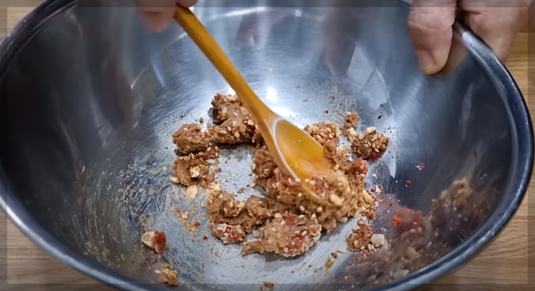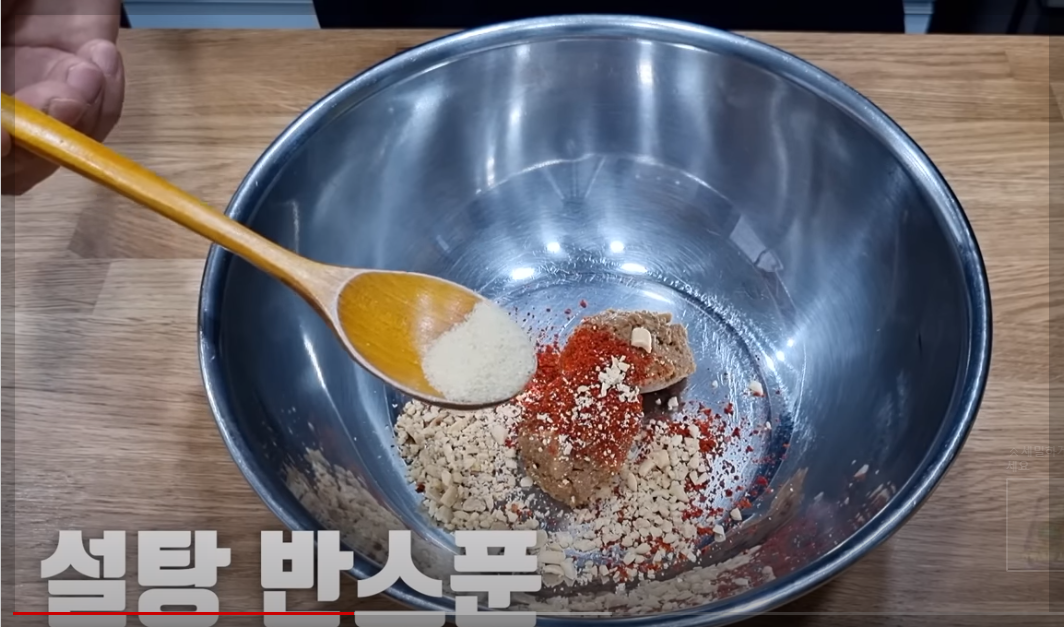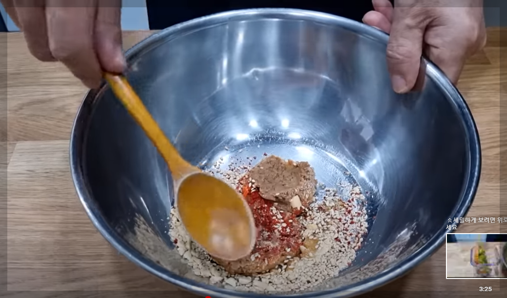 땅콩 10알(빻아서 사용) 설탕 1/2큰술, 참기름 1/2큰 술, 통깨 1큰술