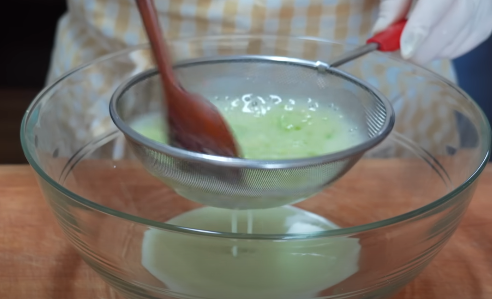 믹서에 간 것을 체에 걸러 내려줍니다 물 750ml 부어주고 양념을 더해 김치국물을 만들어줍니다.