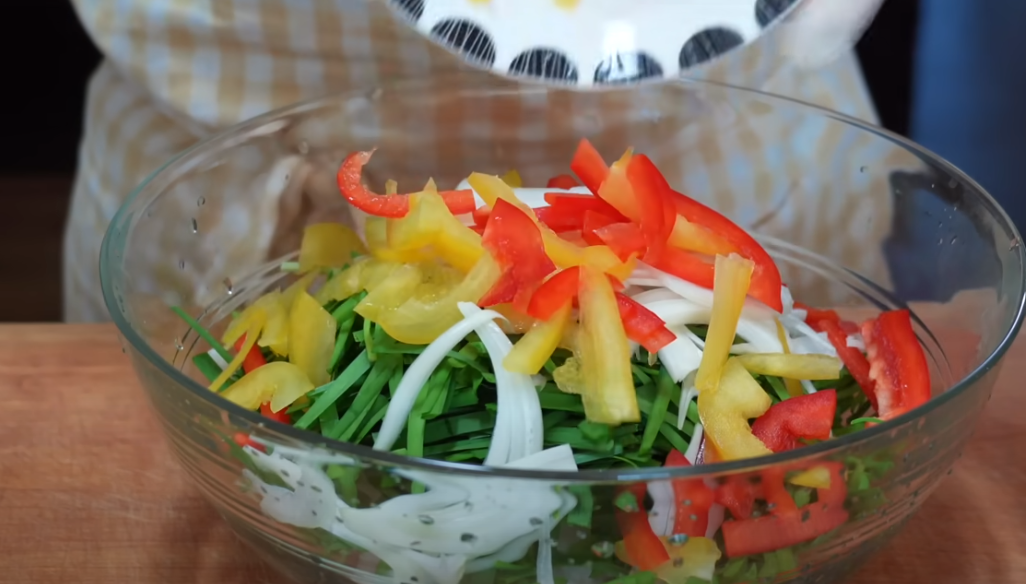 볼에 썰어 준비한 야채 부추, 양파, 파프리카, 무채를 담아주고 굵은소금 1큰술 넣어 살살 버무려 간을 해줍니다.