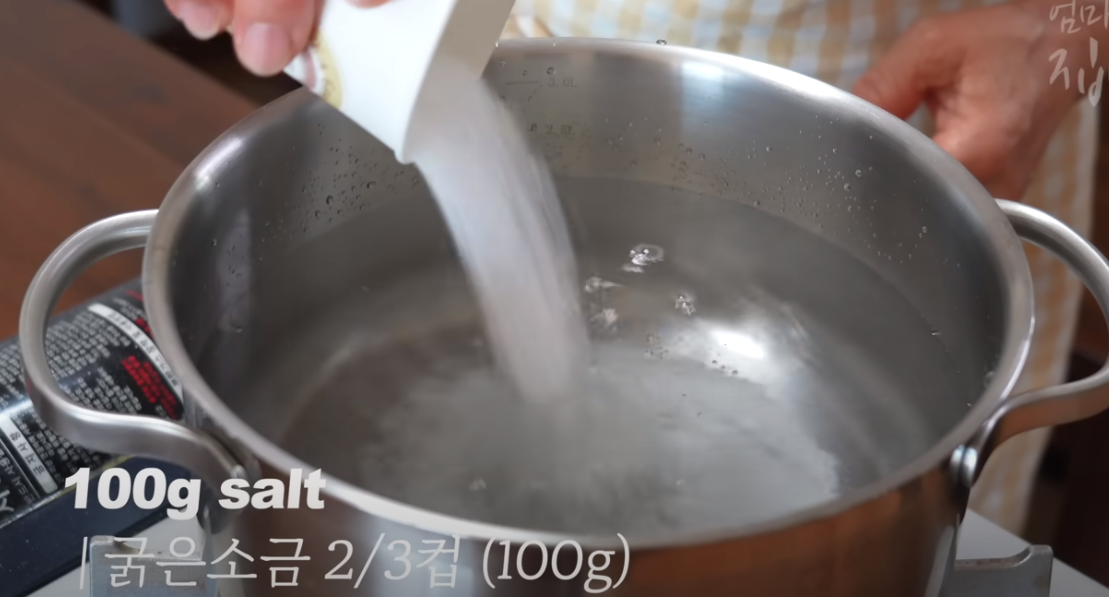 오이 절임물을 만들어 줍니다 물 2리터에 소금 2/3컵 100g을 넣어 가스 불을 켜 팔팔 끓여줍니다.