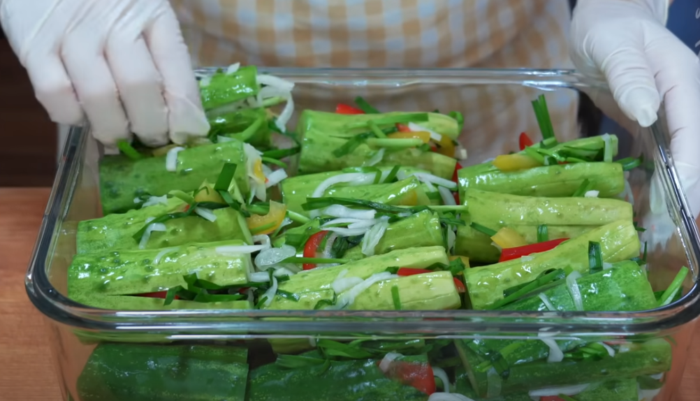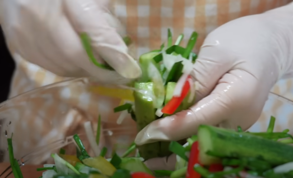 약 5분 정도 간을 해주면 야채가 절여졌을 때 오이 속을 채워줍니다.