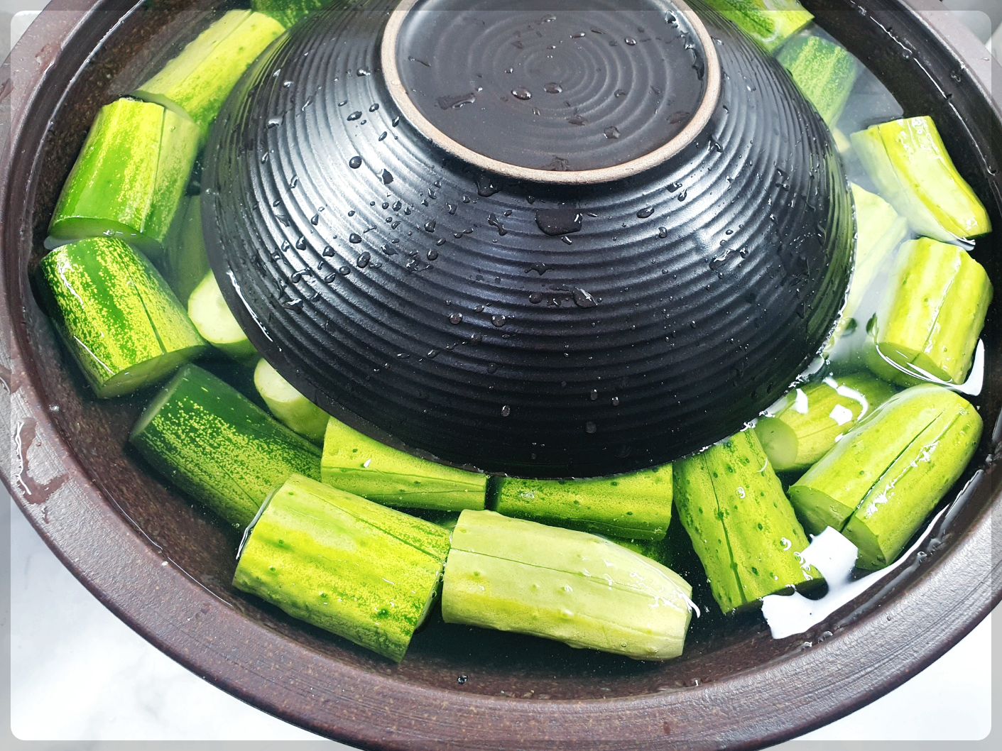 절임물에 손질한 오이를 담아주고 무거운 접시로 눌러 30분 간 절려 주세요. 30분 후 절인 오이는 물에 헹구지 말고