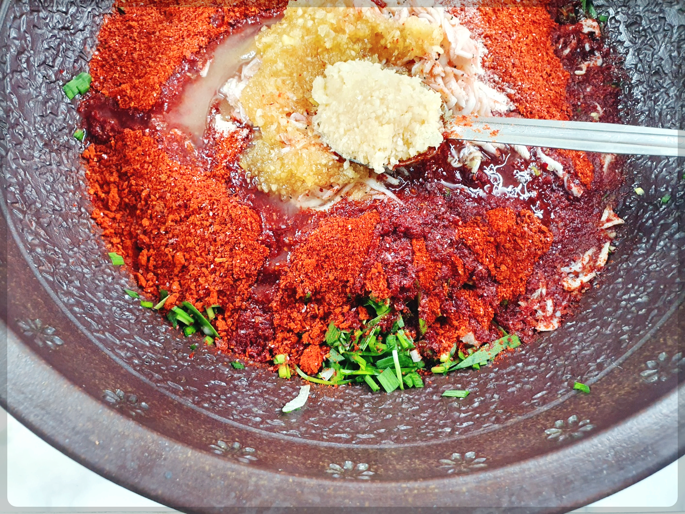 양념: 고춧가루 12큰술,까나리액젓 12큰 술,새우젓 2큰 술,다진마늘 2큰 술 , 설탕 2큰술, 매실액 6큰술, 통깨