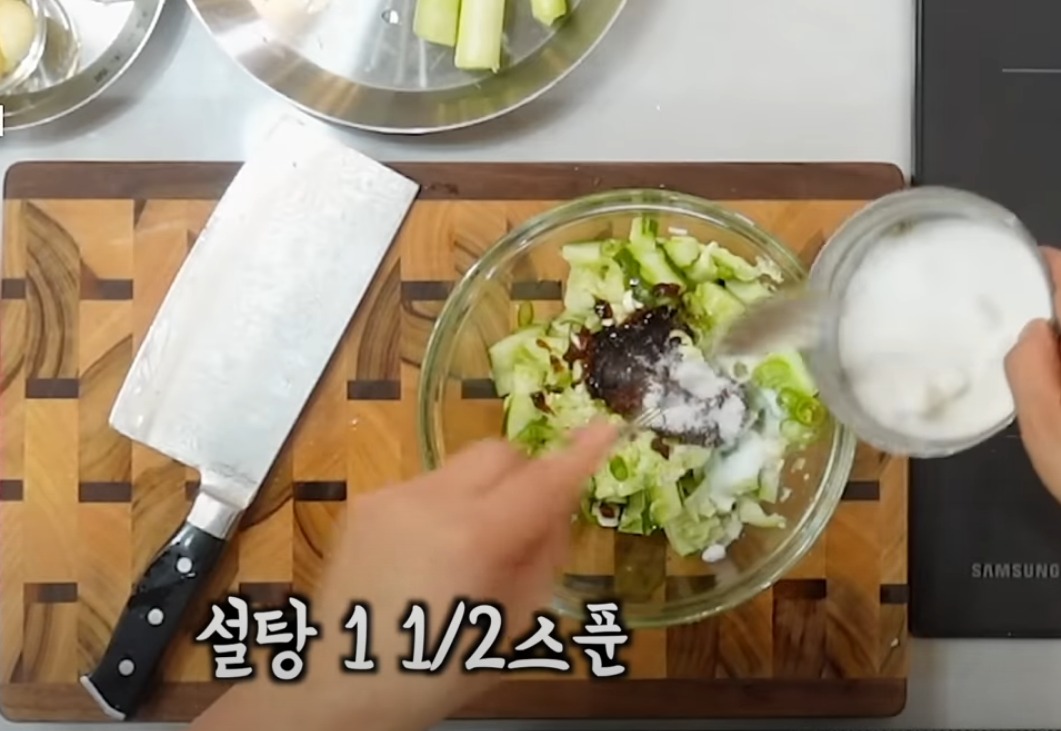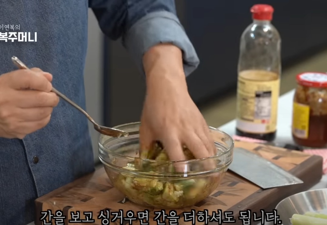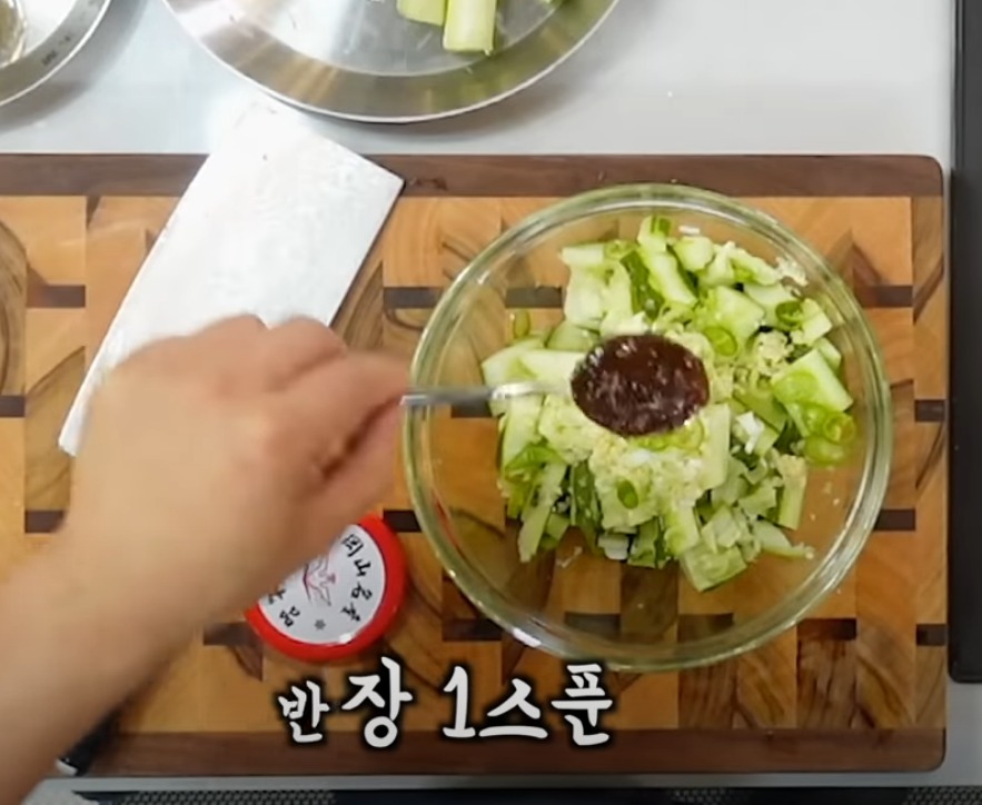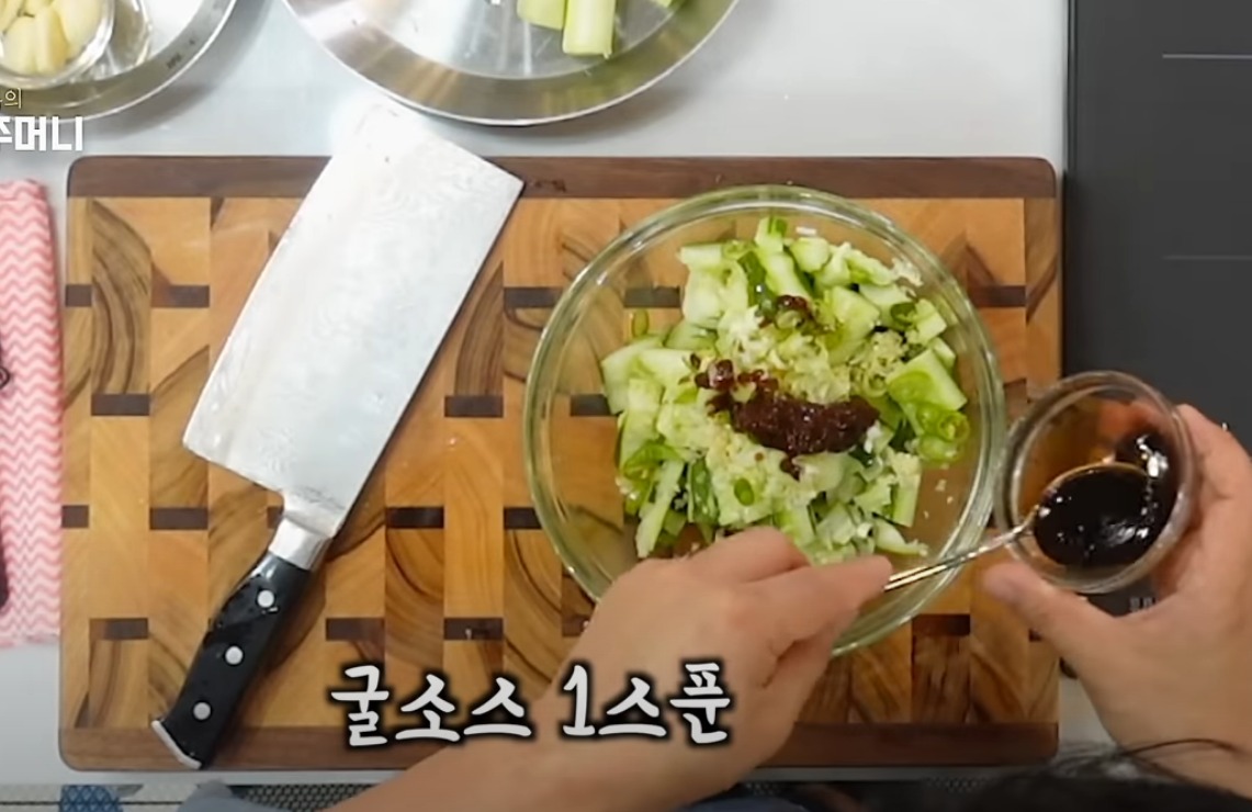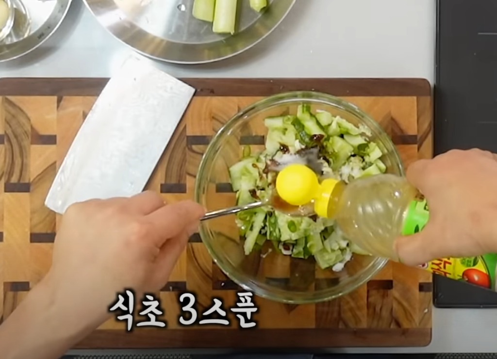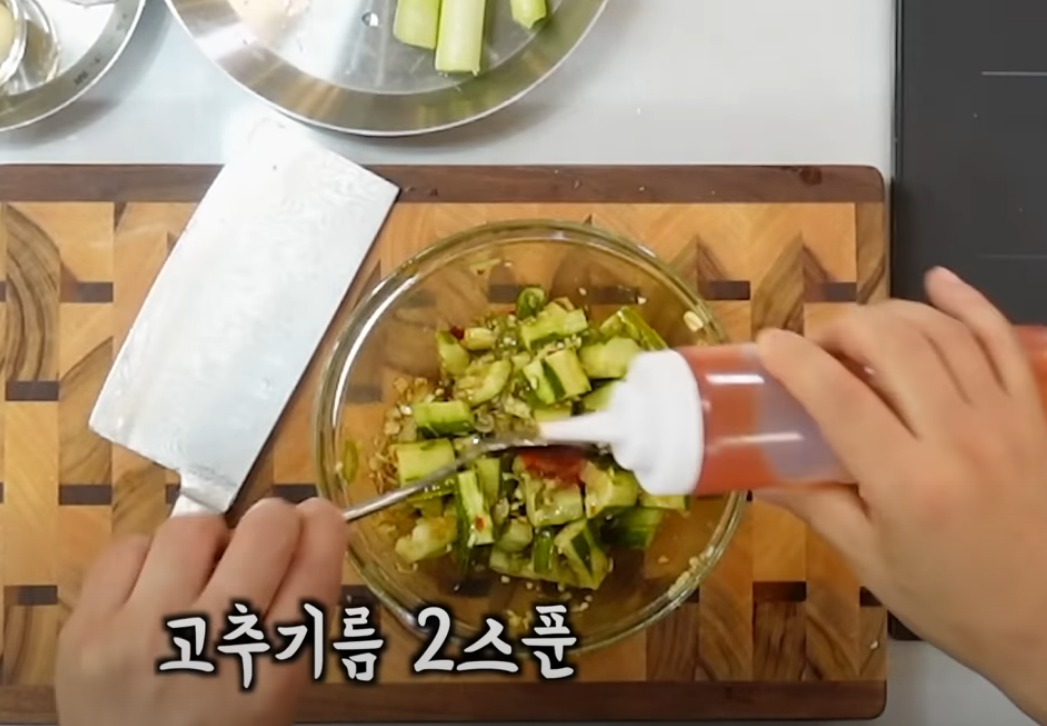 조물조물 양념을 오이와 무쳐준 후 간을 보고 싱겁다면 간을 추가해 주시면 됩니다. 간이 맞다면 마지막 칼칼함을 위해