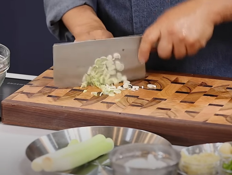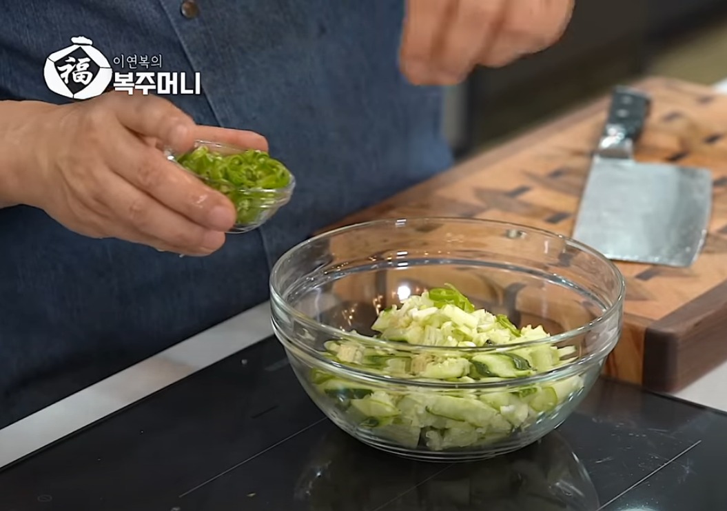 두들겨 선 오이는 믹싱볼에 담아주고 대파 1/2대 송송 썰어 그릇에 담아주고 청양고추는 취향껏 넣어주세요.