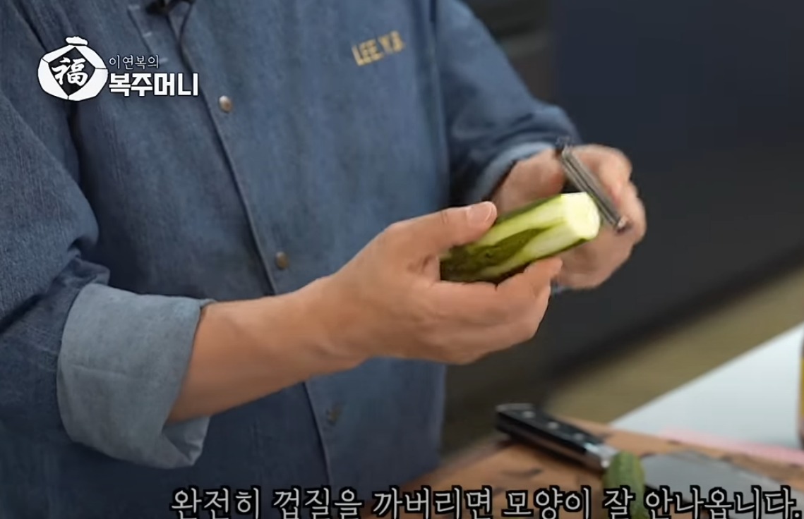 중국오이무침은 전체 껍질을 벗기면 보기에 별로 모양이 좋지 않아요.