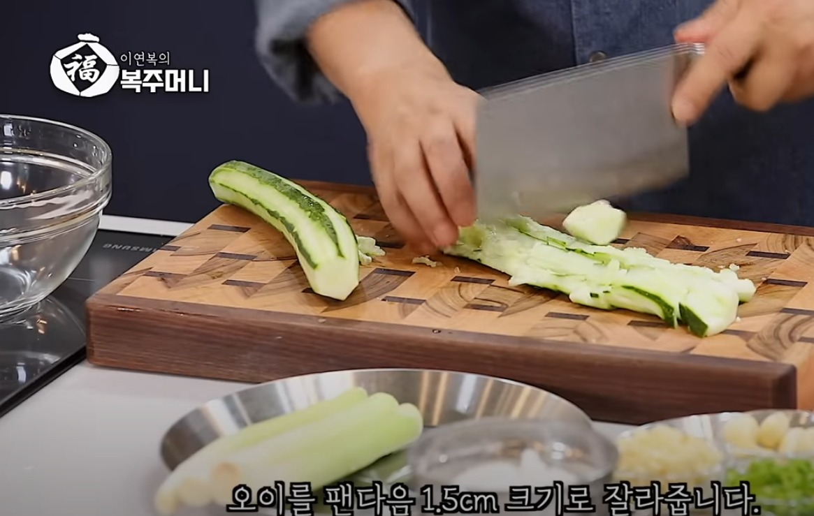 칼로 두들기듯 내려쳐준 오이는 1.5cm 크기 정도로 잘라줍니다.