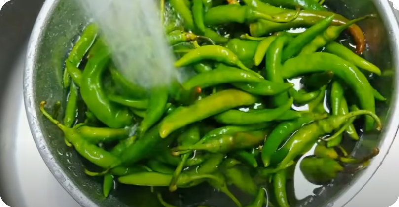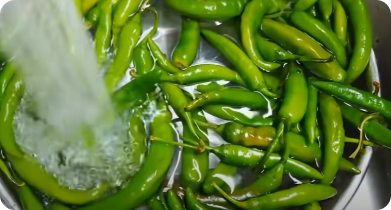 고추룰 흐르는 물에 두 번 씻어줍니다. 2번 씻어준 후 3번째 물에 식초를 넣고 약 20분간 담가놓습니다.