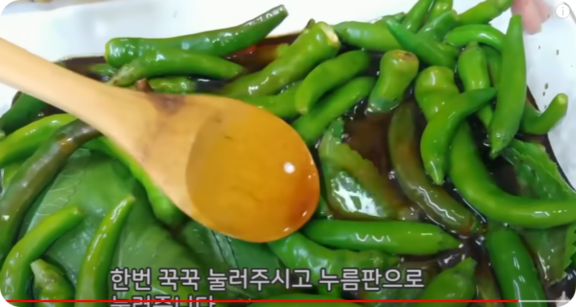 고추가 뜨는 것을 방지해 주어서 좋습니다. 고추, 깻잎, 고추 순으로 담아주세요.