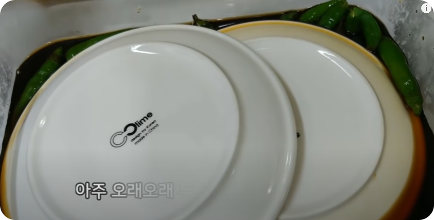 간장물이 배이 거 한번 눌러주고 무거운 접시나 누름판으로 눌러주세요. 간장물이 식은 후 냉장고에 1주일 숙성