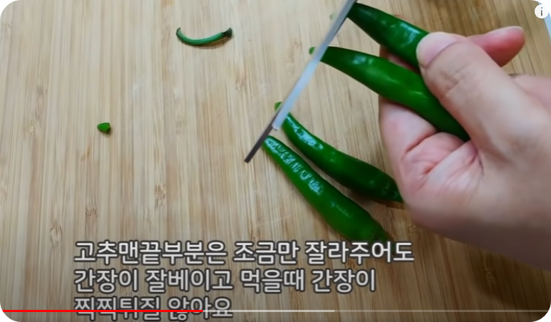 먹을 수 있답니다. 고추 손질을 해줍니다, 고추꼭지를 자르고 고추 맨 끝 부분은 조금만 잘라주어도 간장이 쏙 배이고