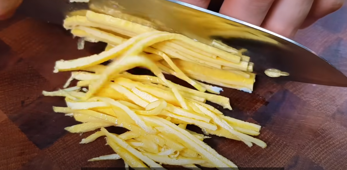 노른자 지단을 가늘게 채썰어 준비해 주세요. 마지막 고명으로 얌전하게 올려줍니다.