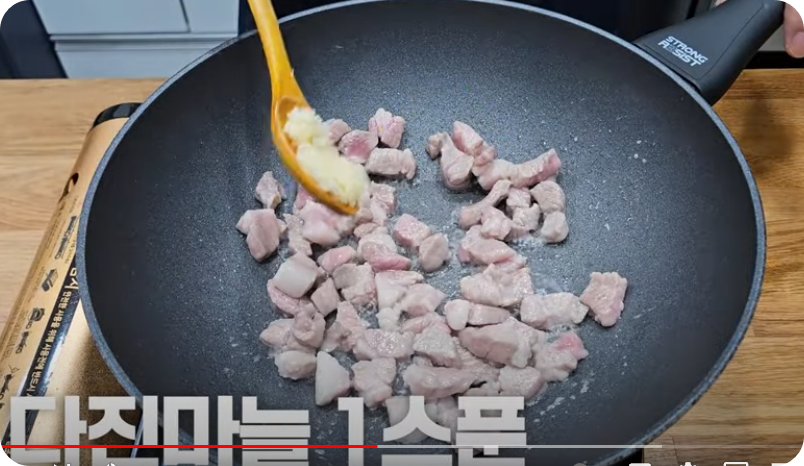 팬에 밑간 재운 돼지목살을 담아준 후 식용유 1큰술 넣어줍니다. 팬이 가열되면 목살을 볶아주세요. 오늘 만드는 카레는