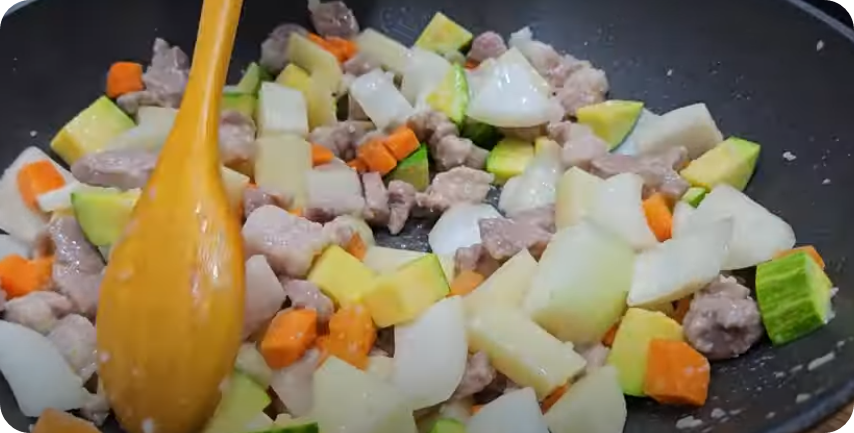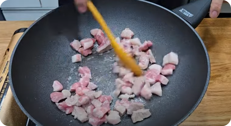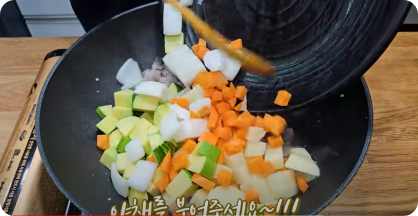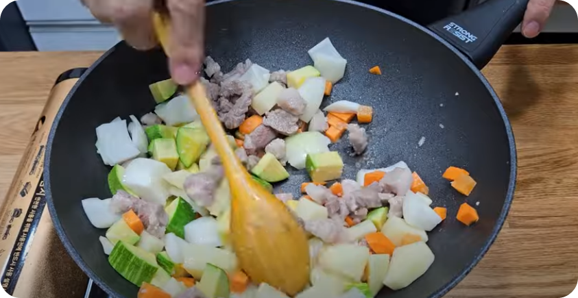 고기 야채 넣어 3분 정도 볶았을때 물 700ml 부어줍니다. 불은 강불을 유지해 주고 끓여줍니다. 물이 끓어 올라오는