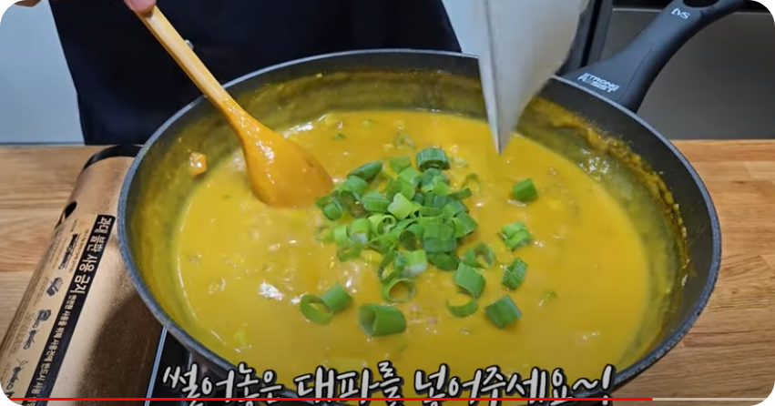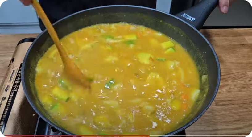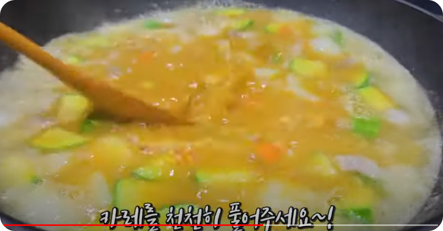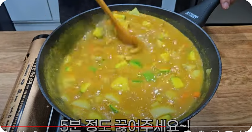 잘 풀어준 카레가루와 함께 약 5분간 가스불은 중약불로 줄여 끓여주세요 중 약불로 약 5분간 끓여주고 오늘의 포인트