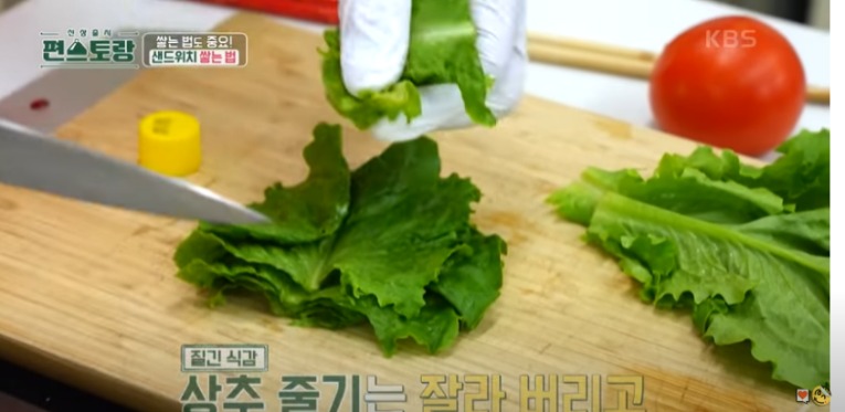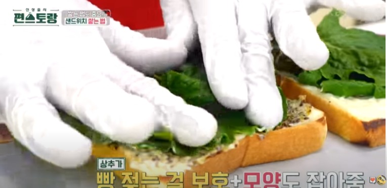 상추 6장 중 3장씩 양쪽 빵에 올려 빵의 모양을 잡아주고 식빵이 젖는 걸 보호해 주어 샌드위치 모양을 잡아줍니다.