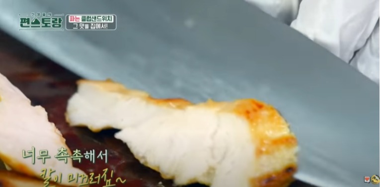 이유는 갓 구운 닭가슴살이 포일에 싸여 잔열로 속까지 촉촉하게 익어 맛이 좋아집니다. 팬에서 익을 때까지 직접