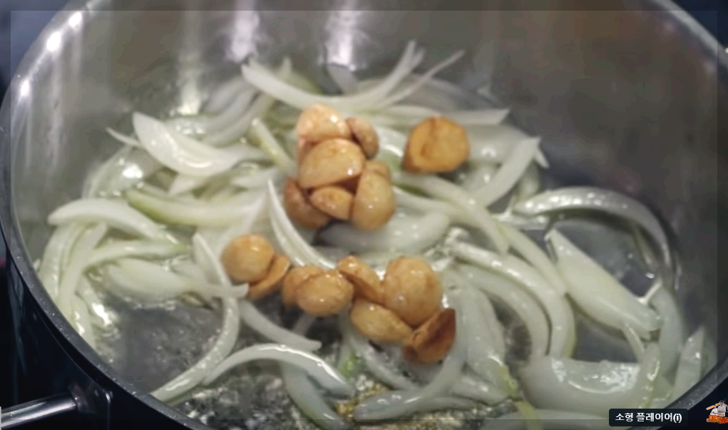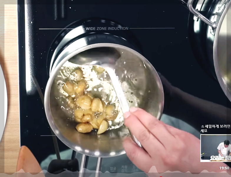 냄비를 달궈 기름을 넉넉하게 부어주고 깐 마늘을 잠길 만큼 넣어주세요, 불은 인덕션은 중 4 정도 가스불은 중불