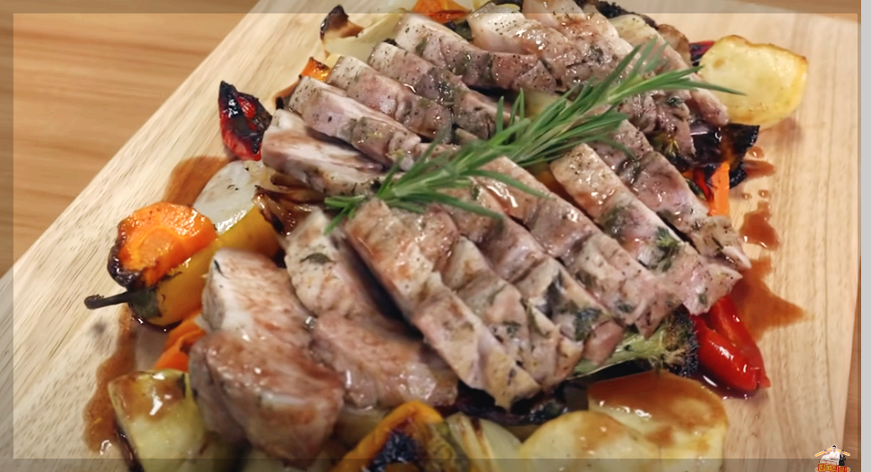 오븐에서 완성된 통삽겹고기를 꺼내 썰어주고 소스를 뿌려 준 후 로즈메리 허브를 더해 장식해 마무리합니다.