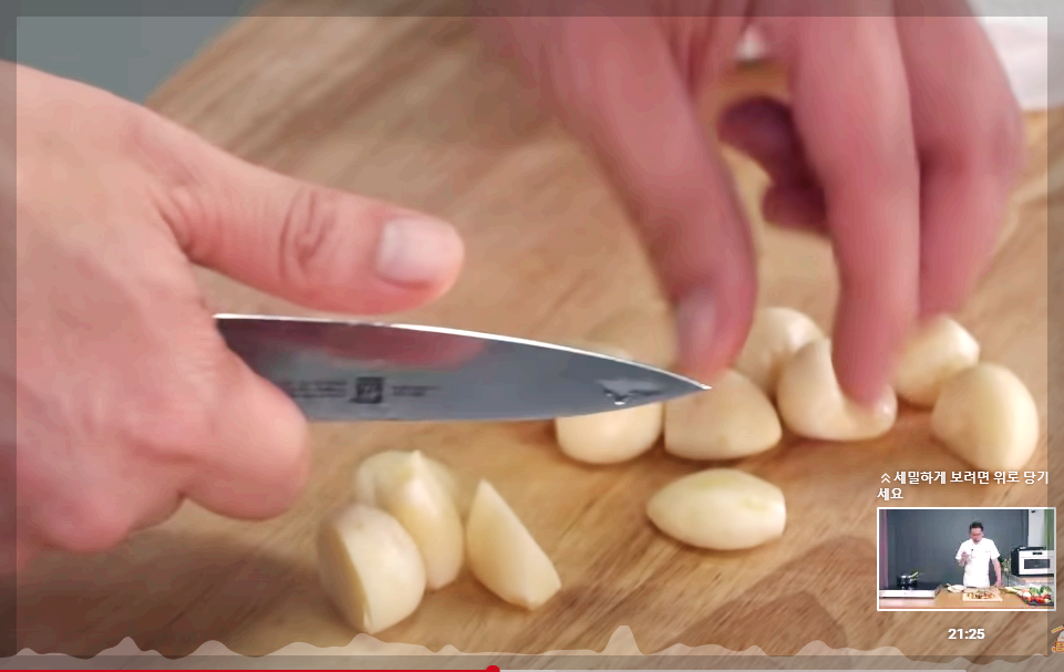 깐 마늘을 준비해족 토마토는 큼직하게 썰어준 후 양파 반 개 채 썰어주세요.