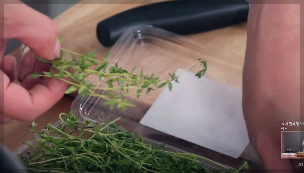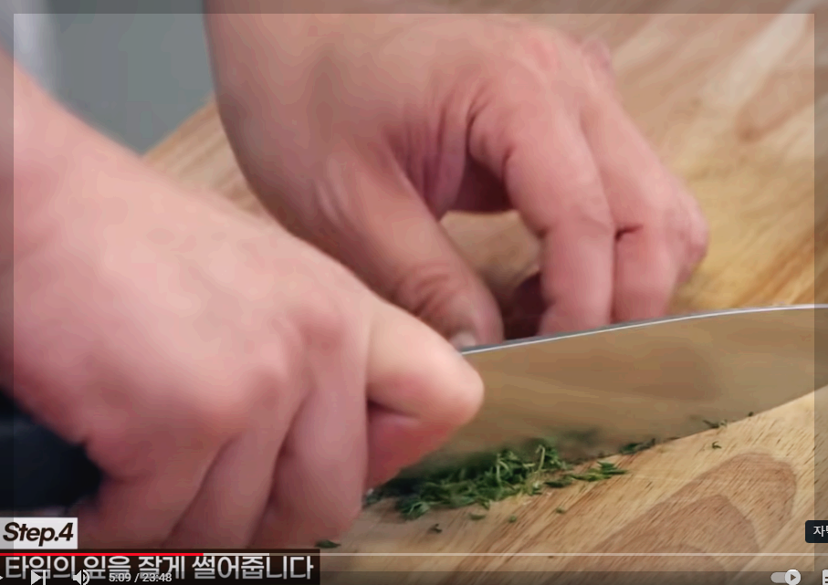허브 타임을 잎만 잘게 다져 주고 올리브유를 뿌려줍니다.
