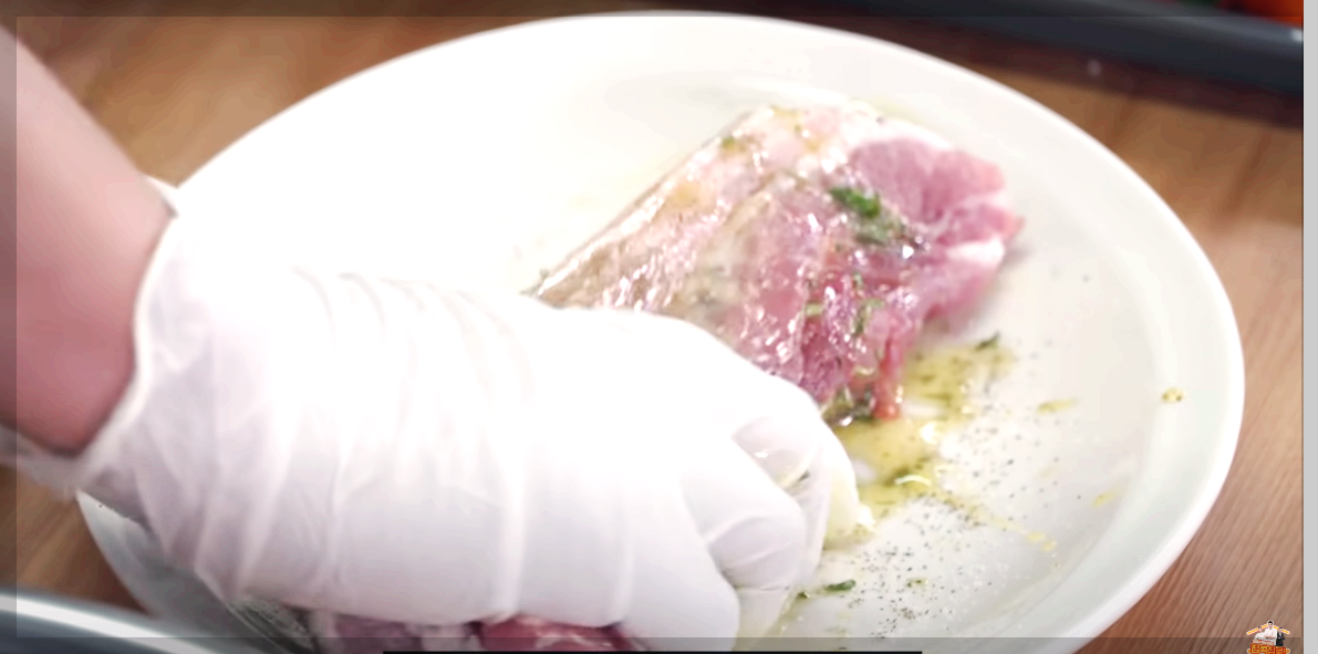 통삼겹 고기에 소금, 후추를 뿌려 밑간을 해준 후 통삼겹살 위에 만들어둔 허브 오일을 발라 줍니다.