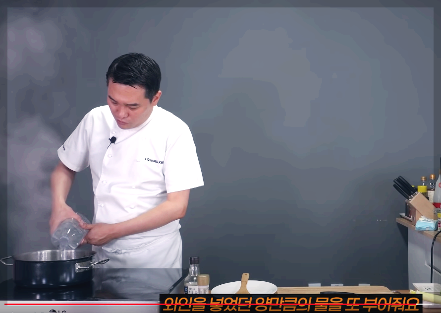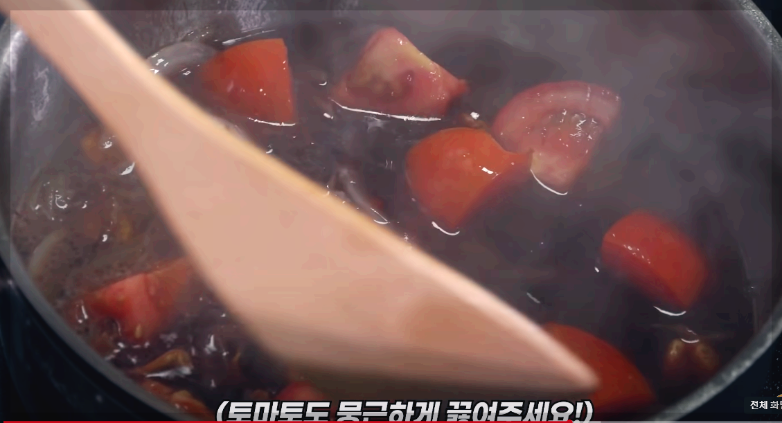 뭉근하게 끓여주세요 레드와인 200ml 넣어줍니다. 어느 정도 졸아들면 와인 양만큼의 물을 부어주세요,