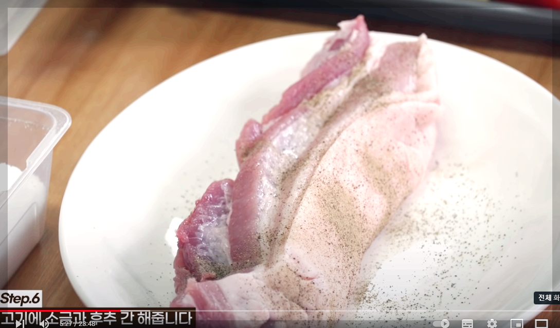치킨스톡 1큰술 반 설탕 가득 2큰술 소금 한 꼬집 넣어줍니다. 통후추 6~7개 넣어주세요.