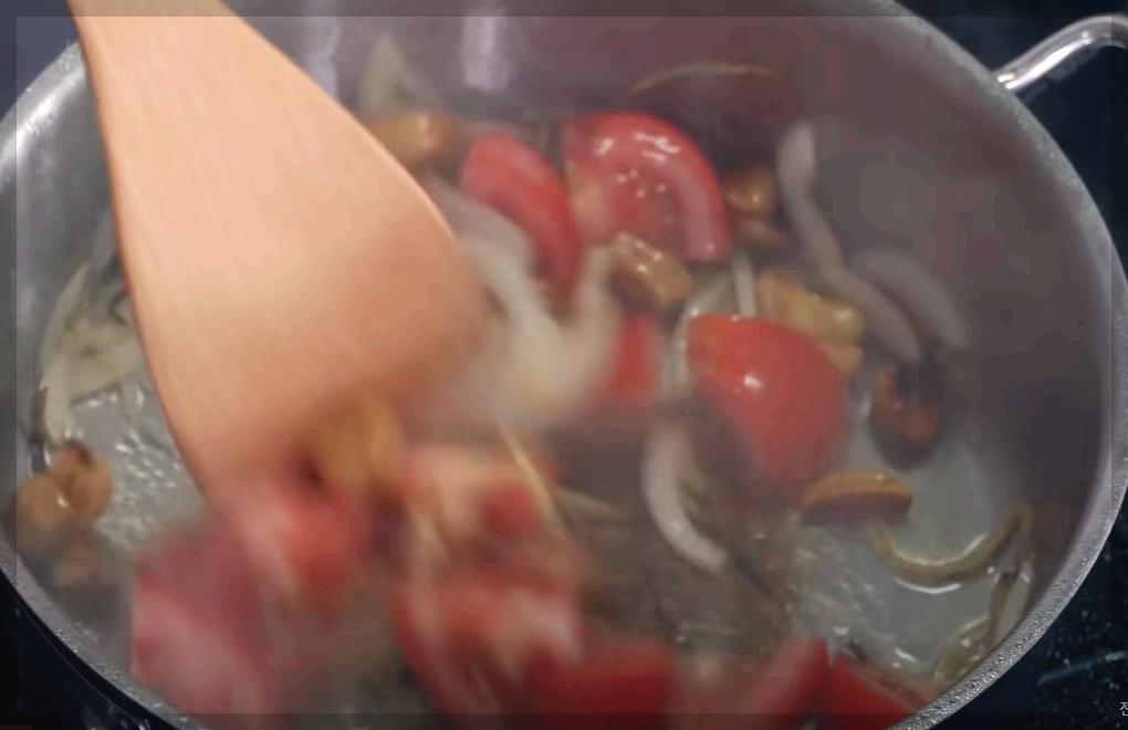 다른 팬에 마늘기름을 덜어 달궈진 팬에 양파를 볶아주다 마늘오일 안의 마늘을 담아주고 토마토를 넣어
