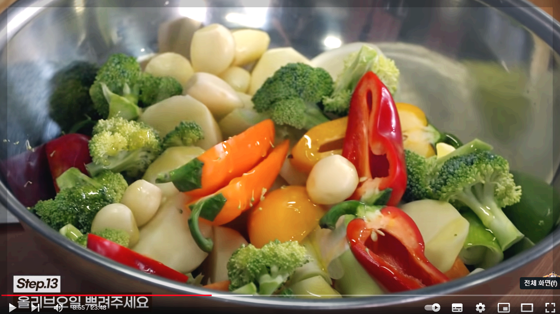 믹싱볼에 손질한 채소를 담아주고 올리브유를 뿌려 골고루 섞어 준비합니다.
