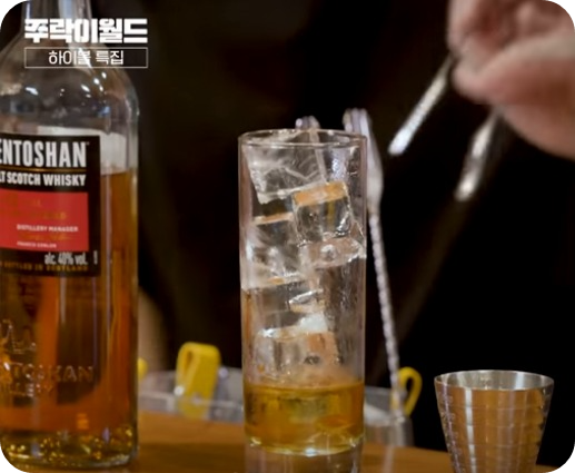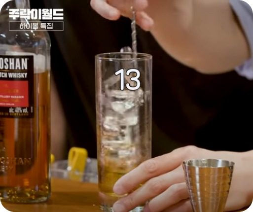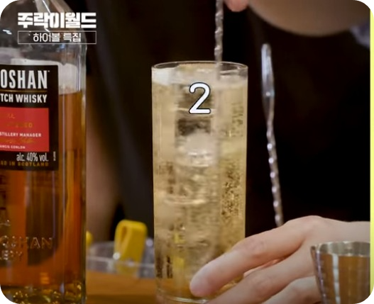 글라스잔에 얼음을 넣고 위스키를 부어준 후 얼음에 탄산수가 최대한 닿지 않게 부어주는 것 이대로만 만들어도