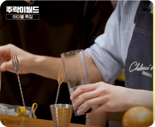 준비 재료: 차가운 하이볼 잔, 돌얼음, 위스키, 탄산수,가니시