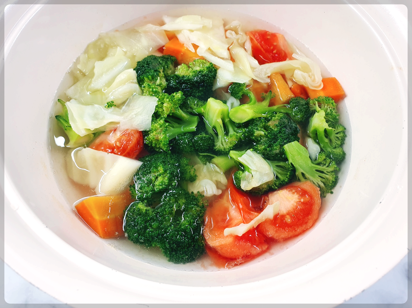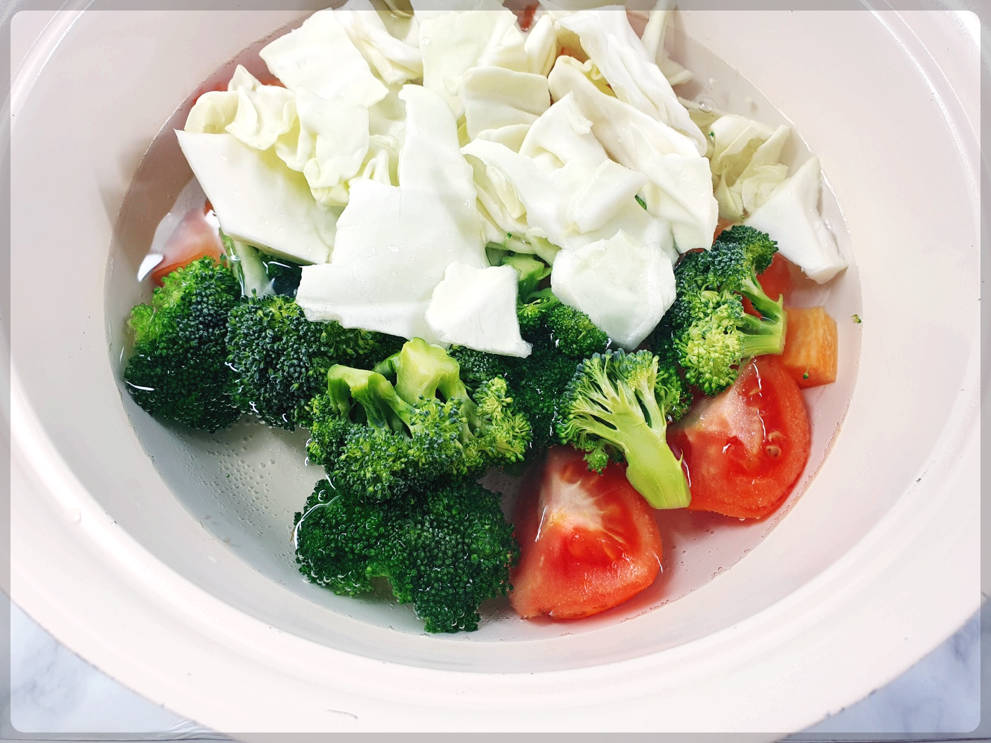 두 번째 방법은 물 800cc를 부어준 후 모든 재료를 한 번에 넣고 15분간 삶는 방법과 제가 하는 방법으로 당근과 토마토를 약 10분간 익혀준 후 양배추, 브로콜리를 5분간 익혀 주는 방법으로 영양분 손실이 적어 이 방법으로 해주면 좋습니다.