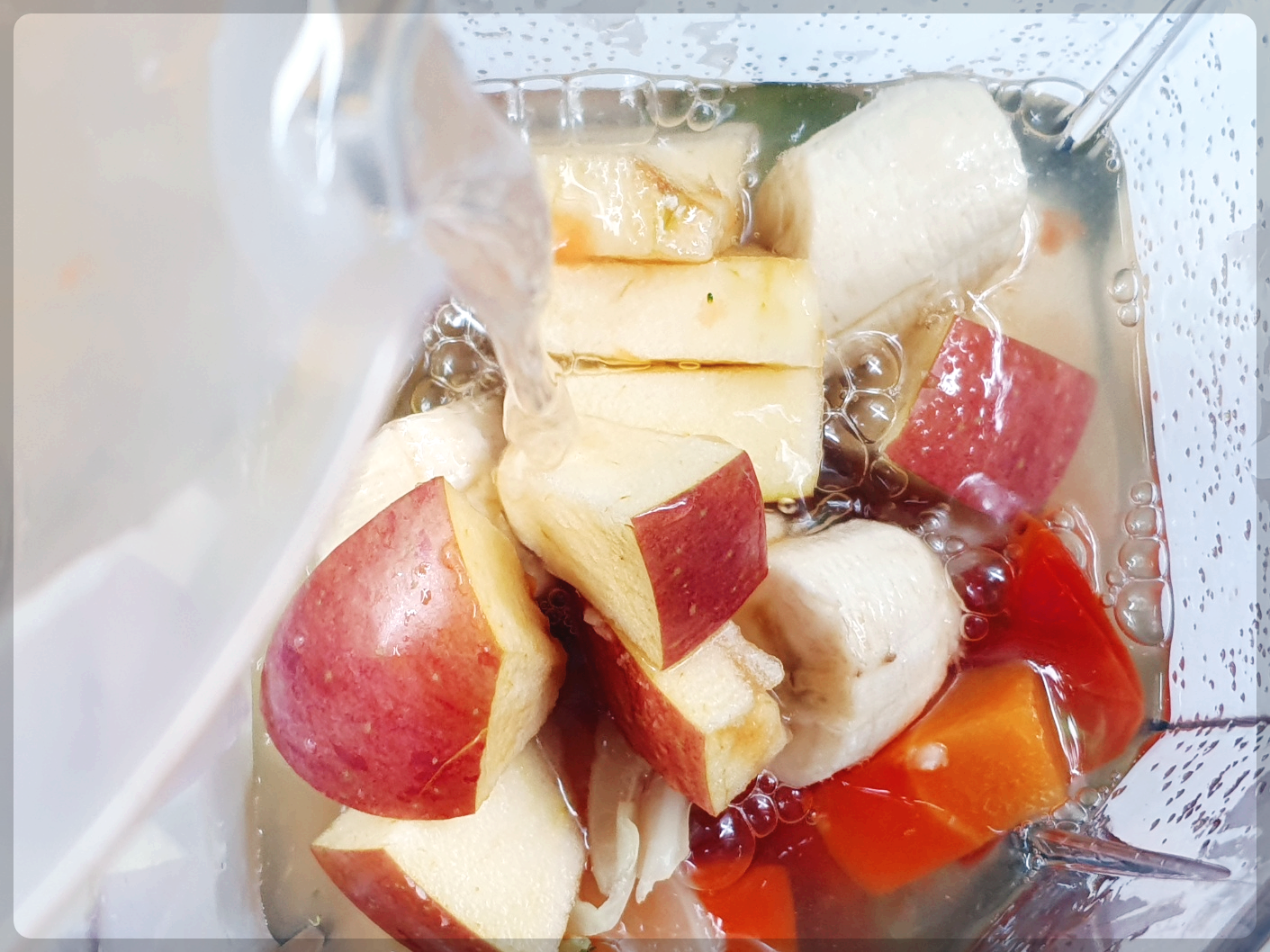 만드는 방법은 어렵지 않습니다, 만약 믹서에 스팀기능이 있다면 각각의 야채와 과일을 믹서에 넣어 물 800cc를 부어