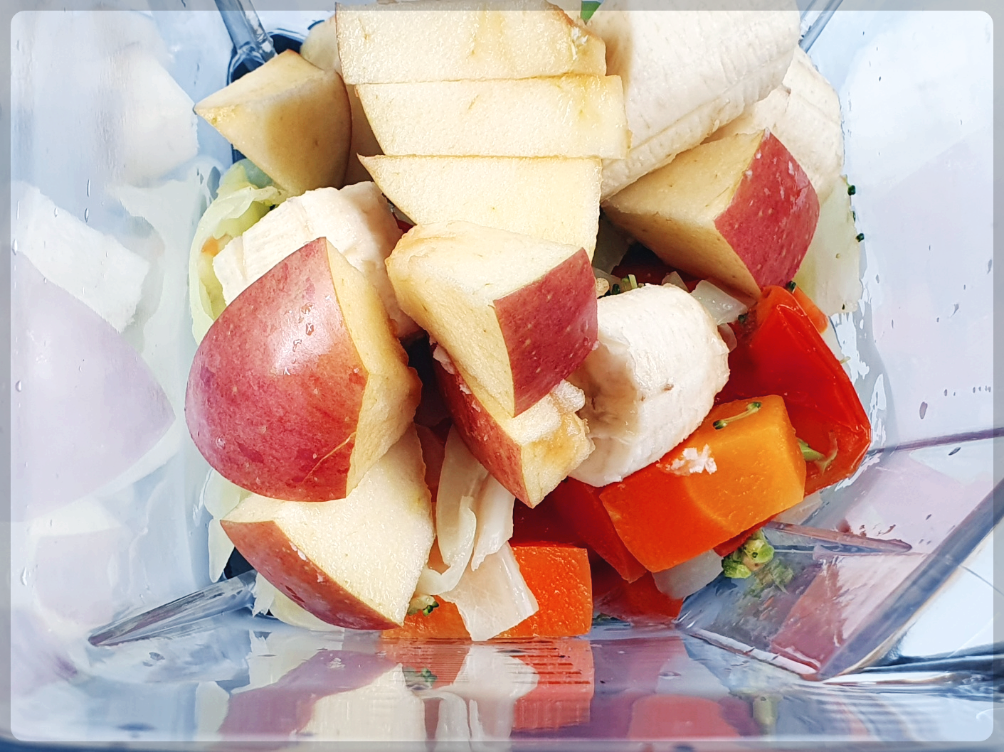 사과와 바나나를 썰어주고 바나나는 껍질째 사용해도 좋습니다. 브로콜리, 토마토, 양배추, 당근도 손질 후 준비합니다.